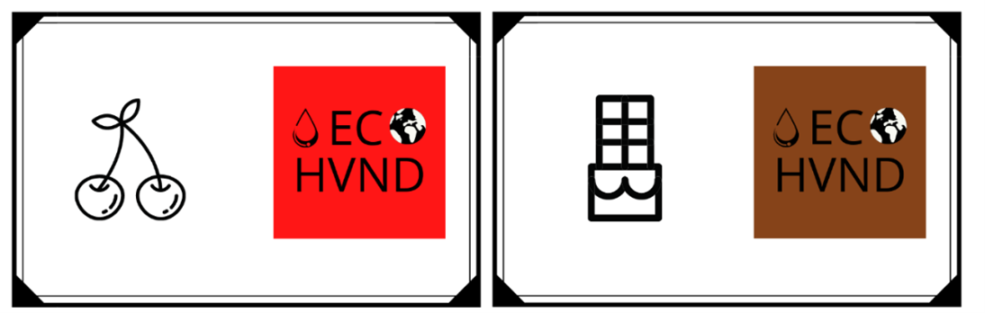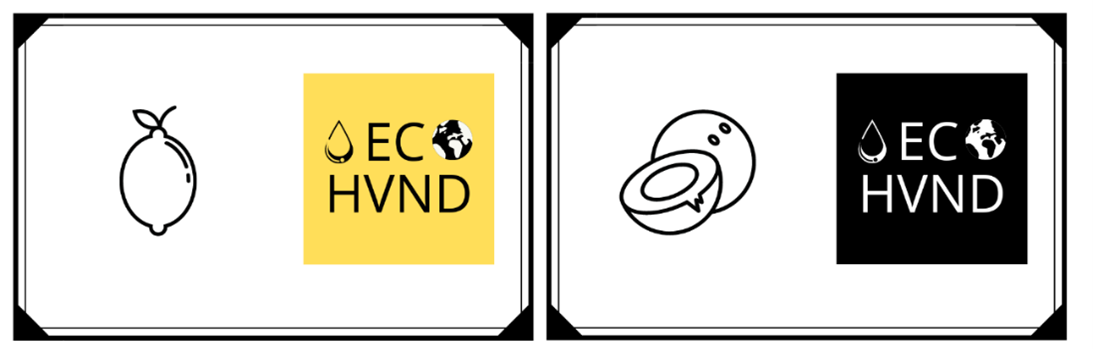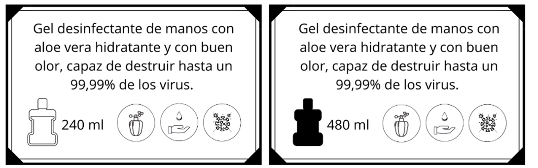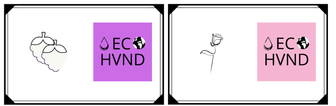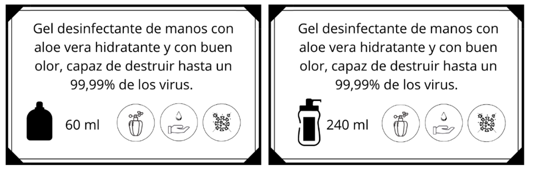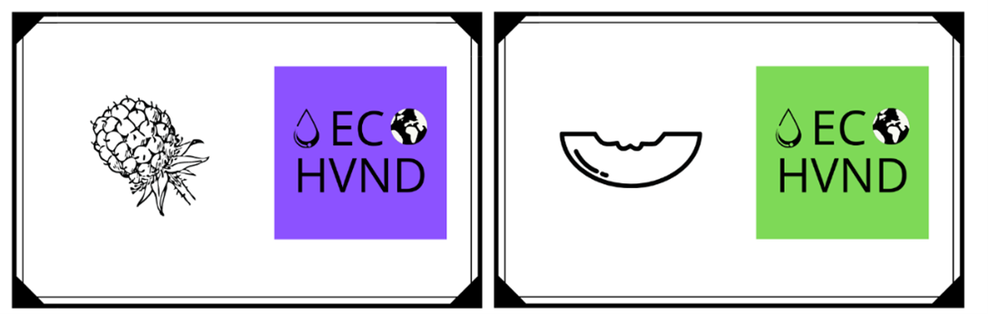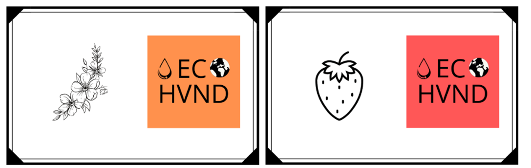 Cada uno de los hidrogeles va acompañado de una tarjeta, en una de sus caras se indica el olor del mismo junto al logo de la marca, mientras que en la otra se muestra una breve descripción del producto, indicando a su vez mediante símbolos que se trata de un producto en spray con aroma capaz de atar a los virus de tus manos. En esta misma parte de la tarjeta se indica el modelo de ECO- HVND adquirido, además de ser un bote hecho a base de plástico reciclado.